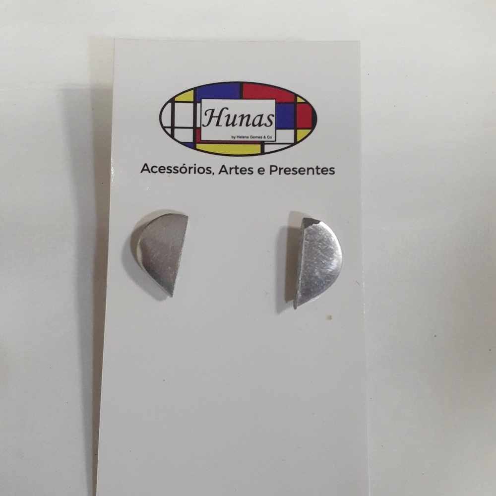 Brinco no formato meia lua pequeno feito de alumínio, um material antioxidante, hipoalergênico e fácil de limpar.
