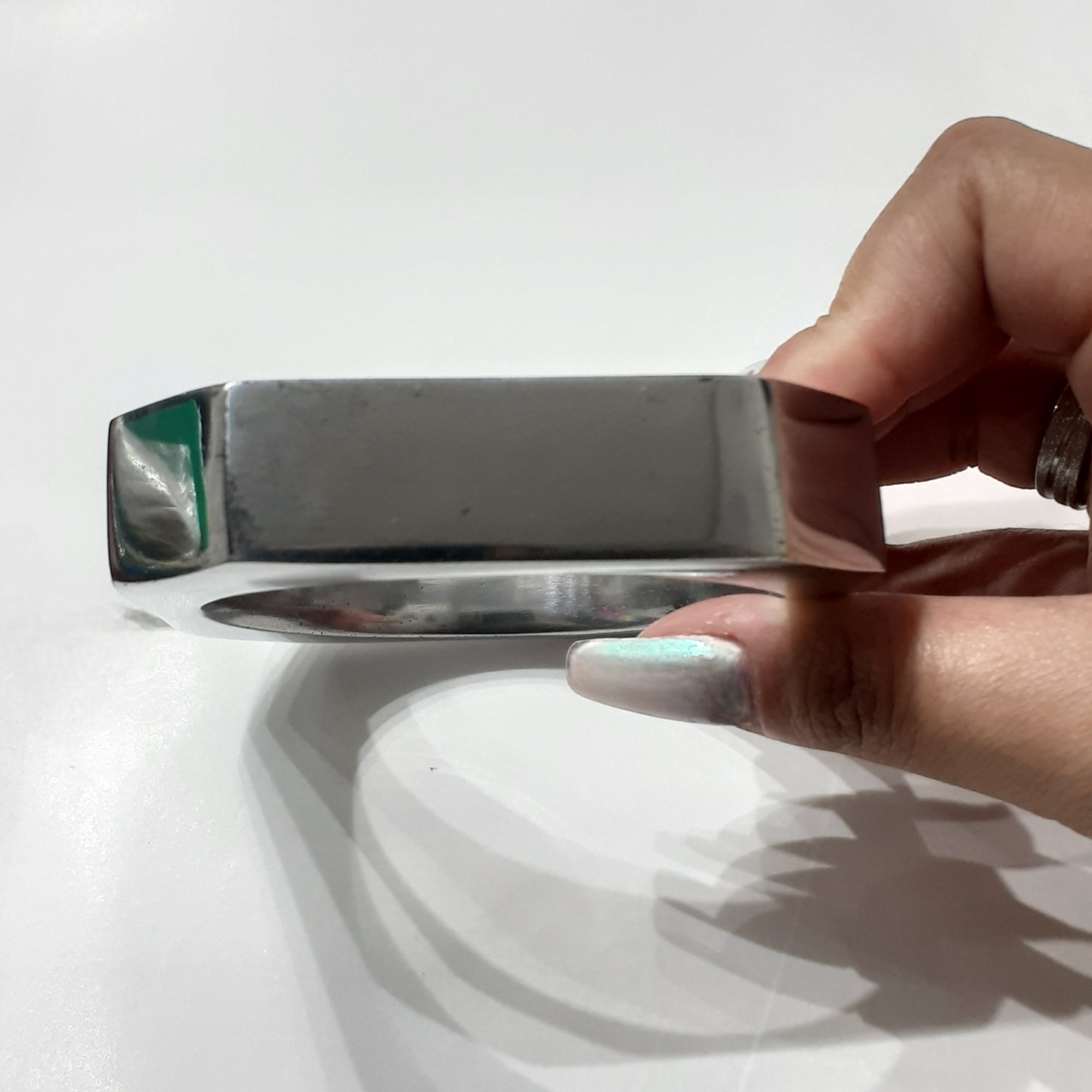Nossa pulseira Elegância é uma pulseira quadrada com as pontas arredondadas feita de alumínio, sendo um material fácil de limpar, antioxidante e hipoalergênico.