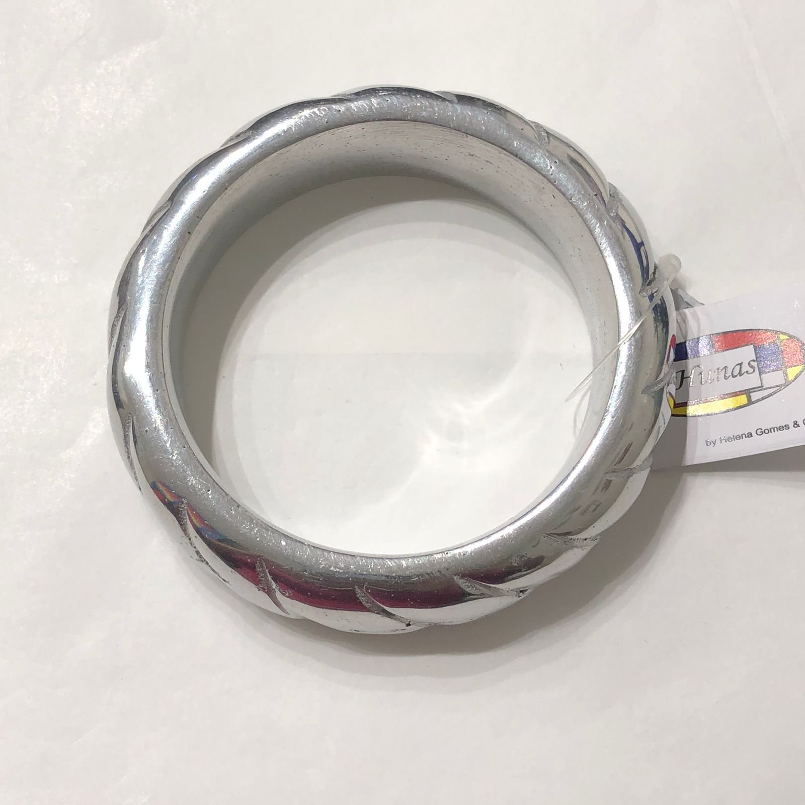 Pulseira “Roda” feita em alumínio, material resistente e fácil de limpar, além de ser antioxidante e hipoalergênico.